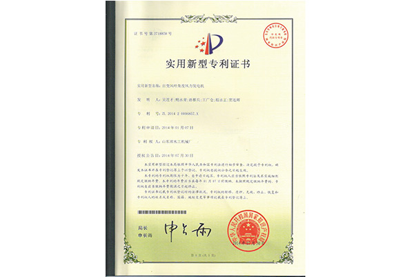 實(shí)用新型專(zhuān)利證書(shū)—自變風(fēng)葉角度風(fēng)力發(fā)電機(jī)